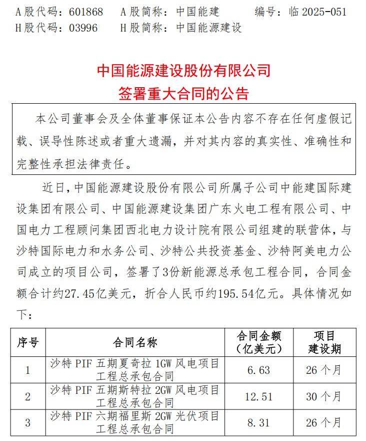 中国能建公告称,近日,公司所属子公司中能建国际建设集团有限公司、中国能源建设集团广东火电工程有限公司、中国电力工程顾问集团西北电力设计院有限公司组建的联营体,与沙特国际电力和水务公司、沙特公共投资基金、沙特阿美电力公司成立的项目公司,签署了3份新能源总承包工程合同。