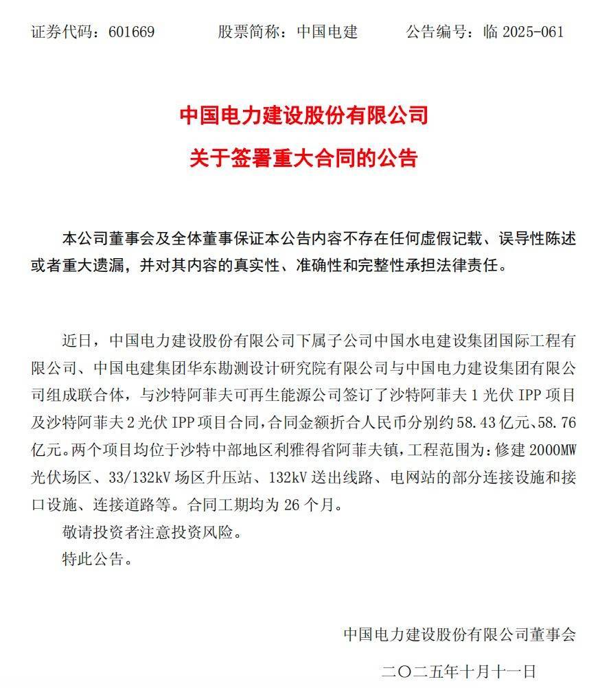 具体来看,中国电建下属子公司中国水电建设集团国际工程有限公司、中国电建集团华东勘测设计研究院有限公司与中国电力建设集团有限公司组成联合体,与沙特阿菲夫可再生能源公司签订了沙特阿菲夫1光伏和沙特阿菲夫2光伏项目合同。